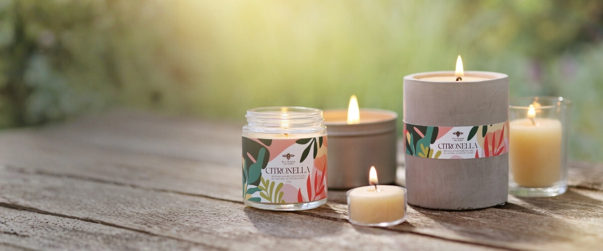 Crafted with pure essential oils of citronella, lavender, and cedarwood for naturally bug-free summer evenings